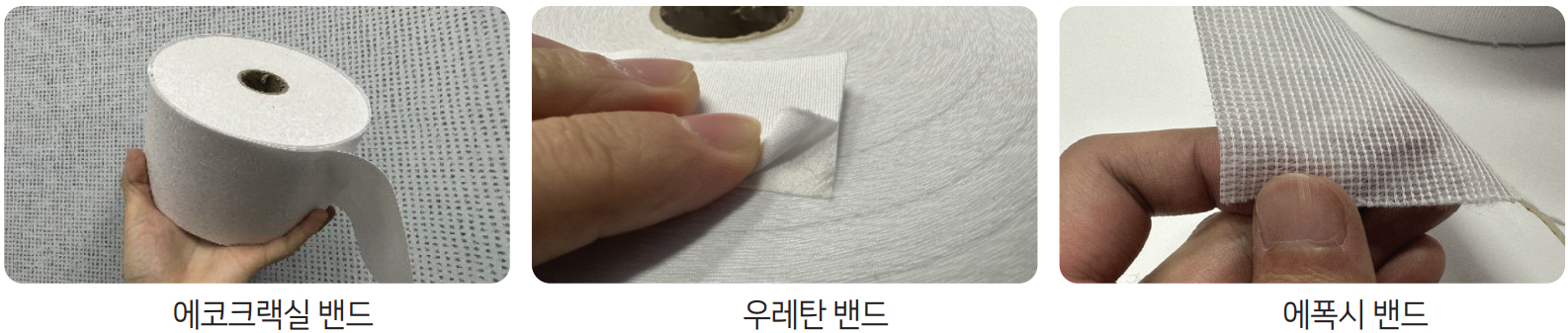 - 에코크랙실 밴드(외벽 균열보수용) : 에코크랙실 2차 퍼티와 함침시 인장, 파단강도, 신장율 크게 향상