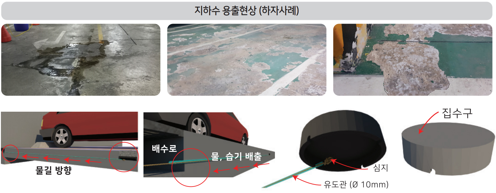 지하주차장 바닥 줄눈과 배수로를 이용해, 수분을 집수하여 배출하는 구조로